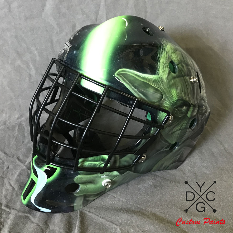 Masque de hockey personnalisé, Star Wars Yoda style, free hand airbrush, galaxie, neon light, réalisme .